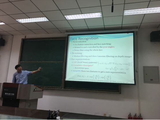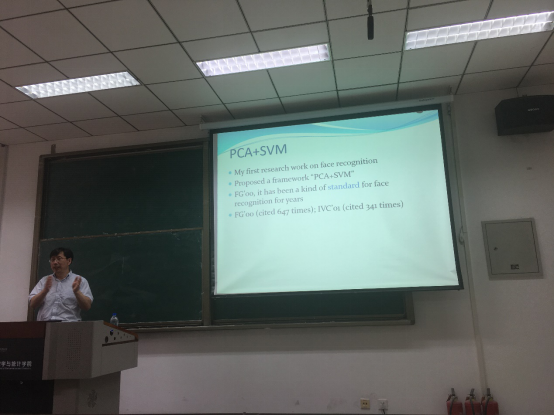 在第一次报告中,郭教授先简要介绍了西弗吉尼亚大学及其生物特征识别在美国的研究发展历程。然后介绍了其早期的基于PCA和SVM的面部识别工作。然后根据识别问题由简单到复杂的变化,讲了识别方法发展的必要性和有效性。随后郭老师介绍了他们早期的两个脸部识别算法FG’00和IVC’01, 这两个算法目前已经成为脸部识别的标准,文章引用分别达到了647次和341次。在报告中,郭教授从背景和应用驱动出发,着重讲述工作的灵感来源和意义,报告由浅入深,让大家不但了解了面部识别的背景和意义,也从中学到了一些做研究的方法。第一次报告由朱强教授主持,冯像初教授、周水生教授、叶峰副教授和数公司的一些博士生和硕士生参加了报告。在报告结束后,冯教授和郭教授针对报告中的问题进行了学术研讨。