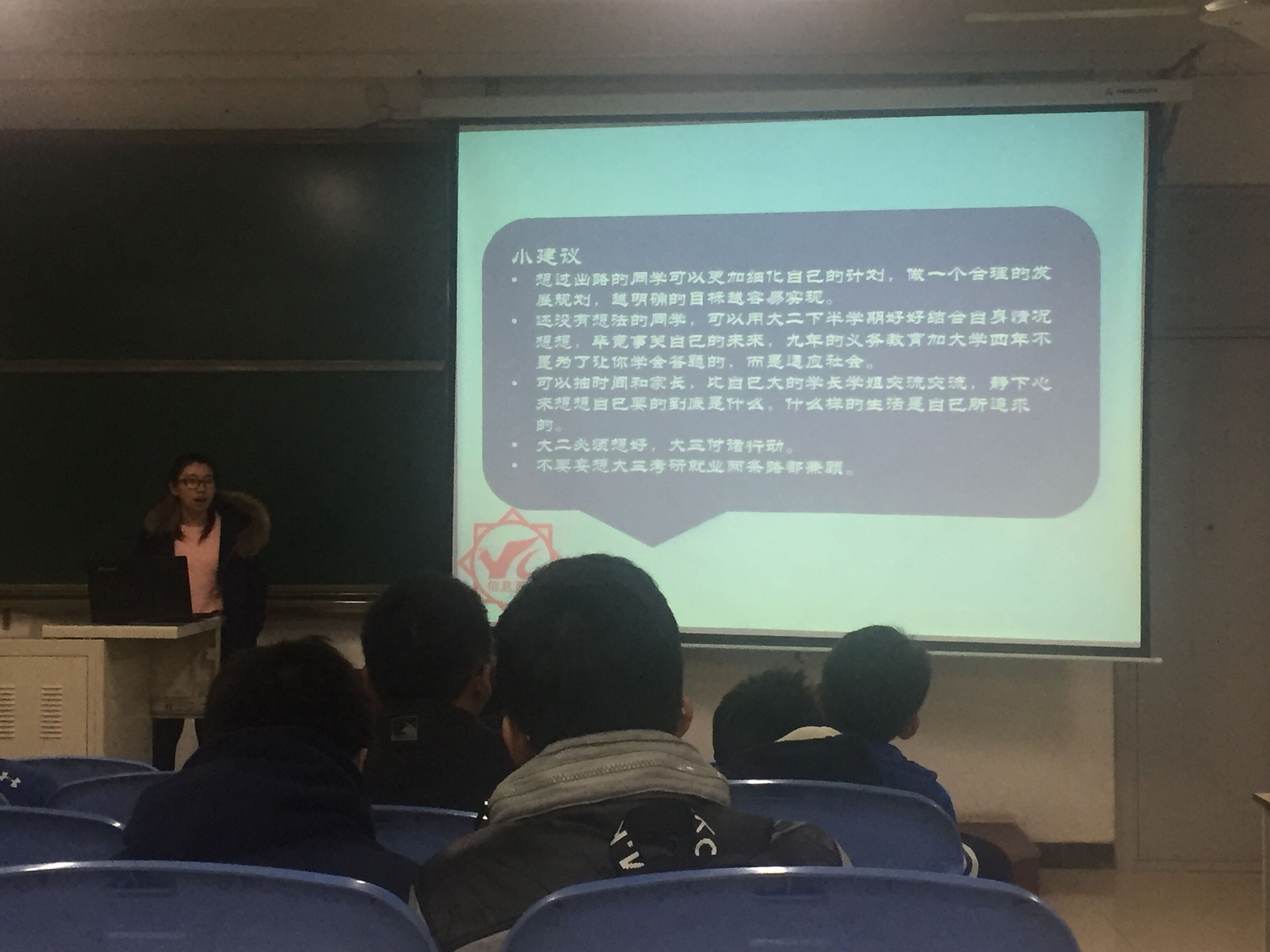 2016年11月27日2015级信息英才班“路在何方——大学的前半段和后半段”主题班会在B507教室顺利召开。 班主任宁万涛老师出席了本次班会。此次班会的召开主要目的一是对大学前半段生活的回顾二是对所剩大学时光的发展规划,让同学更好的认知自己,确立明确的目标,不虚度光阴。